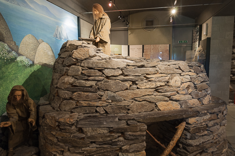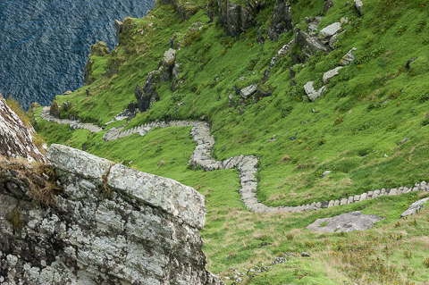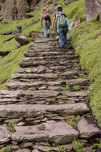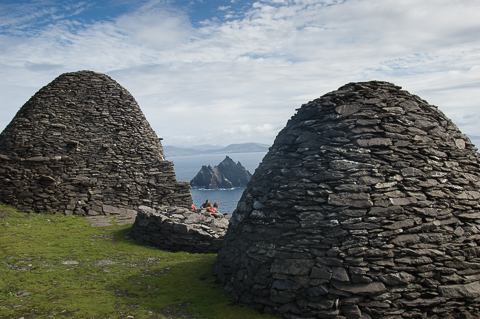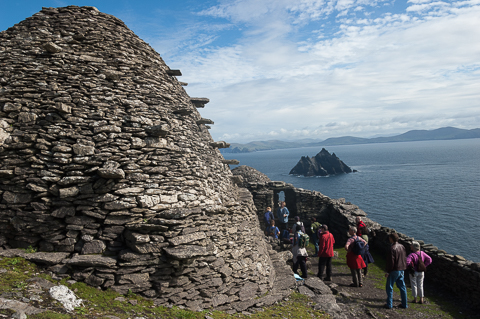 670 Stufen - nur für schwindelfreie Menschen - sind es, die überwunden werden wollen, will man dann zur ehemaligen Mönchssiedlung emporsteigen, die möglicherweise bereits im 6. Jh. vom hl. Finan gegründet wurde. Sechs der Bienenkorbhütten blieben erhalten, wohl auch deshalb, weil sie in Trockenbauweise ohne Mörtel errichtet wurden. Sie sind außen rund und innen rechteckig und wurden oben mit einem einzigen Stein verschlossen. Daneben blieben noch zwei bootsförmige Gebäude unzerstört (6.-9. Jh.), möglicherweise Stätten des Gebets. Die Reste einer Kirche stammen aus dem 11. Jh.