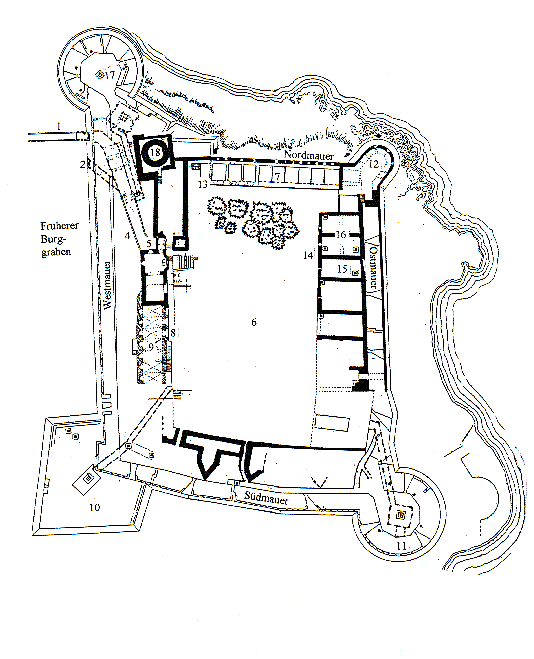 Wir queren den kleinen Zwinger (Vorplatz) vor dem Torbau mit den Wappen der Lusignanfamilie. Im Durchgang, wo heute das nachgebildete Grab des Flottenkommandanten Sadik Pascha "der Algerier" liegt, der 1570 Kyrenia (Girne) eroberte, war im fränkischen Mittelalter die Wachstube untergebracht. Das Gebäudeensemble um den Zwinger zählt zu den ältesten fränkischen Bauten der Burg. Nach Verlassen des Torweges nimmt den Besucher ein überraschend weiträumiger Innenhof auf. Unter einer Baumgruppe laden Tische und Stühle zu einer Rast ein. Hier kann man seinen Sandwich bestellen, sich an kalten und warmen Getränken laben und in den angrenzenden Gewölben einen Souvenirladen durchstöbern, vielleicht einen kleinen Kelim erstehen oder Kupfernes, Reiseführer, Ansichtskarten, Textilarbeiten. Aus dem Schatten ihres Rastplatzes öffnet sich den Besuchern der Blick auf die vier Seiten des Innenhofes mit einem aus ganz unterschiedlichen Epochen stammenden reizvollen Gemenge von Treppen, Türmen und Fassaden, Bögen, Konsolen und Wällen. Steigt man nun zuerst hinauf oder hinab ? Viele Besucher zieht es magisch zu den "dungeons", den mittelalterlichen, tief in den Felsgrund getriebenen Kerkern, in denen die Lusignanherrscher in Ungnade gefallene Angehörige führender Familien einem qualvollen Tod aussetzten. Noch heute lassen die düsteren Schreckenskammern mit ihren drastisch nachgestellten Folterszenen manch Arglosen schaudern - gequältes Lachen und heftiges Mitteilungsbedürfnis dort unten schaffen offenbar Entspannung . . . Wo die Herrscher gelebt haben, die solche Todesverliese erdachten, sind nur dürftige Spuren der einstigen Pracht geblieben. Die königlichen Gemächer lagen hoch über den Kerkern. Eine gut erhaltene Sakristei, angrenzend an die Ruinen einer Kapelle, Spitz- und Rundbogenfenster, Steinplatten auf dem Boden, Reste einer Loggia lassen mit viel Phantasie das Bild einer glanzvollen Hofhaltung lebendig werden.