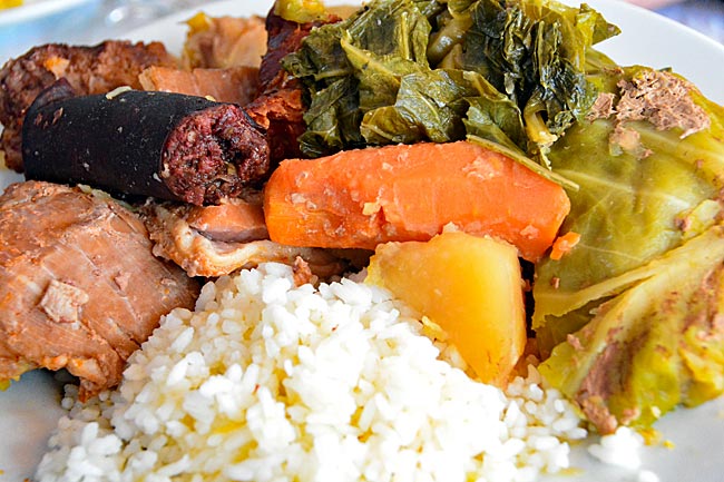 Nach dem Anstieg werden wir reichlich belohnt: Schon bevor der eigentliche Ort namens Furnas beginnt, geht es auf einer Allee durch eine exotische, parkähnliche Landschaft. Bereits von Weitem sieht und riecht man, dass der ganze Ort unter Dampf steht: Fumarole rauchen und verbreiten Schwefelgeruch. In denen wird auch der berühmte Cozido gegart, ein Eintopf aus Schweine- und Rindfleisch, Huhn, Wurst, Kartoffeln, Möhren, Yams und Weißkraut, der in den heißen, schwefeligen Erdlöchern steckt und dadurch einen besonderen, leicht rauchigen Geschmack erhält. Danach sollte man allerdings nicht mehr aufs Rad steigen, sondern lieber den paradiesischen Terra-Nostra-Park mit seinem Warmwasserbecken besuchen. Im orangeroten, 38 °C warmen Wasser tummeln sich allerhand Menschen. Auf 12 Hektar sollen sich hier um die 2.500 exotische Bäume befinden und vielerlei exotische Blumen wie Azaleen, Bromelien und Camelien. Zwischen Zischen, Blubbern und Dampfen entspannen wir mit Cozido im Bauch.
