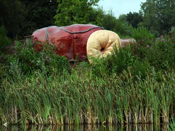 Bevor der Besucher zum Bambusreigen gelangt, stößt er auf farbig bemaltes Wurzelwerk, das zu einer vogelähnlichen Skulptur umgestaltet wurde. Nur Schritte sind es bis zur monumentalen Installation aus weißem Gestänge, in die “Vogelköpfe” mit zwei “Schnäbeln” eingehängt sind. Michiel Van Overbeek ist die Installation aus Antennen zu verdanken, die am Ufer des Weihers ihren Platz hat. Vor der Terrasse der Cafeteria stehen “Duckdalben” im satten Grün der Ruderalpflanzen. Eine riesige Doppelschaukel aus „Eisengeflecht“ schuf Erik Verboven. Ob sie auch funktioniert?