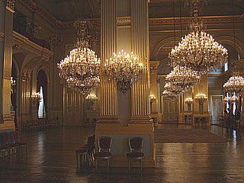 Die Säle im Inneren wurden nach dem Vorbild des Schlosses von Versailles in Neobarock gestaltet. Weißer Marmor und grüner Marmor für die Treppe und das Geländer sowie das sandsteinerne Mauerwerk springen demjenigen ins Auge, der das Ehrenvestibül betritt und die Ehrentreppe empor schreitet. Das Große Vorzimmer beeindruckt durch die allegorischen Figuren des Frieses, für den François Rude die Darstellungen der Schifffahrt und des Handels entworfen hatte, während Jean-Louis van Geel der Urheber von „Industrie“, „Landwirtschaft“, „Streitkräfte“ und „Frieden“ ist. Vergoldete Säulen und Kapitelle, Balustraden und Bogenfelder sind der beherrschende Eindruck des Empiresaals, in dem der Hof die Neujahrsempfänge abhält.