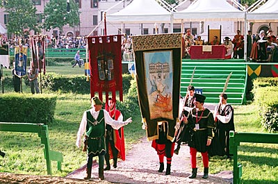 Am Tag des Wettkampfes ist das historische Zentrum, das die Unesco schon seit 1995 als beispielhafte Stadt der Renaissance zum Weltkulturerbe zählt, Aufmarschierfeld der Abordnungen der acht Rioni und Borghi, wie die Viertel hier genannt werden. T-Shirts, kurze Röcke und Jeans wurden gegen lange Gewänder und bunte Beinkleider getauscht. Der Zug nimmt Aufstellung im Innenhof des burgähnlichen Castello Estense. Der Sitz der Este, ausgestattet mit Graben, Ziehbrücken und Wehrtürmen, erzählt noch von der Furcht der Familie vor der eigenen Bevölkerung.