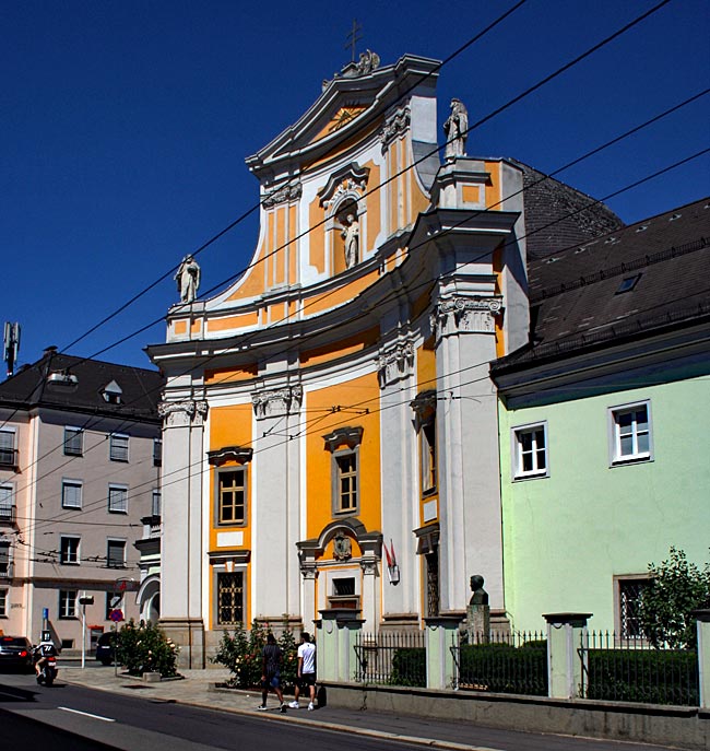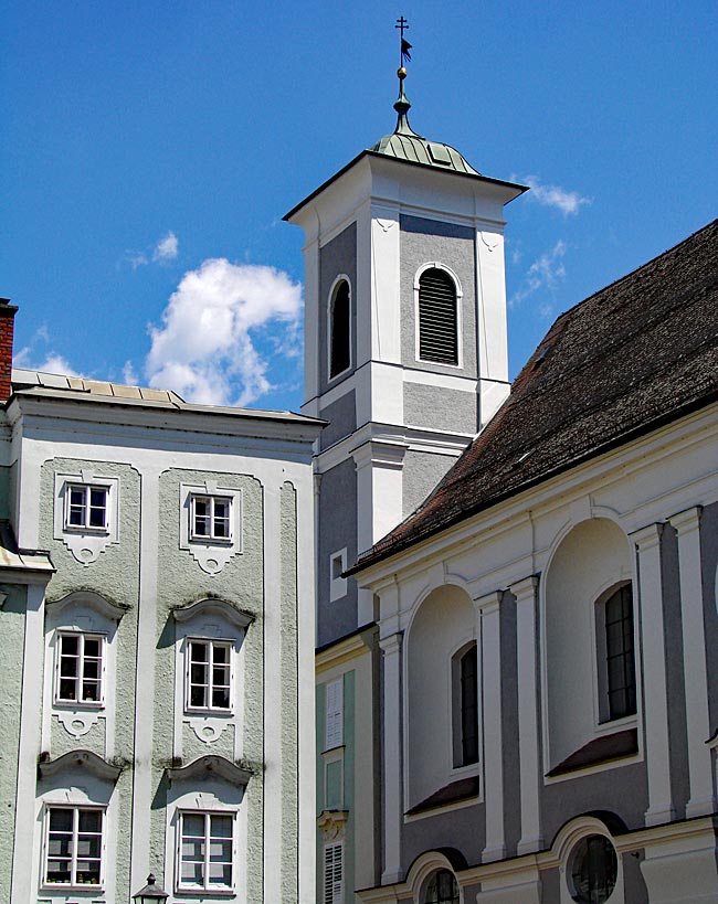 Biegen wir vom Hauptplatz aus in die Klosterstraße ein, so erwartet uns dort die zweiportalige, äußerlich in schlichtes Grau und Weiß gekleidete Landhauskirche, die mit dem Ensemble des Landhauses eine Einheit bildet. In der Landhauskirche hat sich Bartolomeo Altomonte zwar nicht wie in der Elisabethenkirche mit einem Fresko, dafür aber mit einem Altarblatt verewigt.