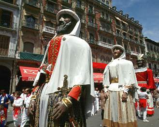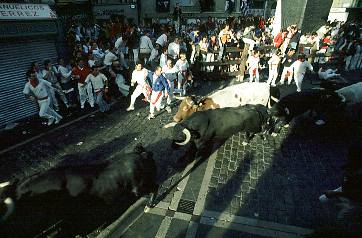 830 Meter laufen sechs Kampfstiere samt Begleitochsen an jedem Morgen von den Stallungen nahe der Stadtmauer bis zur Arena - und vor ihnen ein riesiger Pulk an Läufern, mozos, die vor den Hörnern der 600-Kilo-Kolosse davonsprinten. Wer vor Ort dabei sein will, geht am besten in die Arena, um den Schluß-Einlauf von mozos und Stieren zu sehen. Derweil haben die Rot-Kreuz-Helfer an der Strecke alle Hände voll zu tun - an sage und schreibe 15 Stationen, wo sie Schürfwunden, Prellungen und Quetschungen verarzten; auch Todesfälle hat es schon gegeben. Und zwischen den encierros sorgen Konzert- und Tanzveranstaltungen, die Umzüge von Großkopf- und Riesenpuppen, der unsägliche Stierkampf, Jahrmarkt, Folklore und Feuerwerk für Abwechslung.