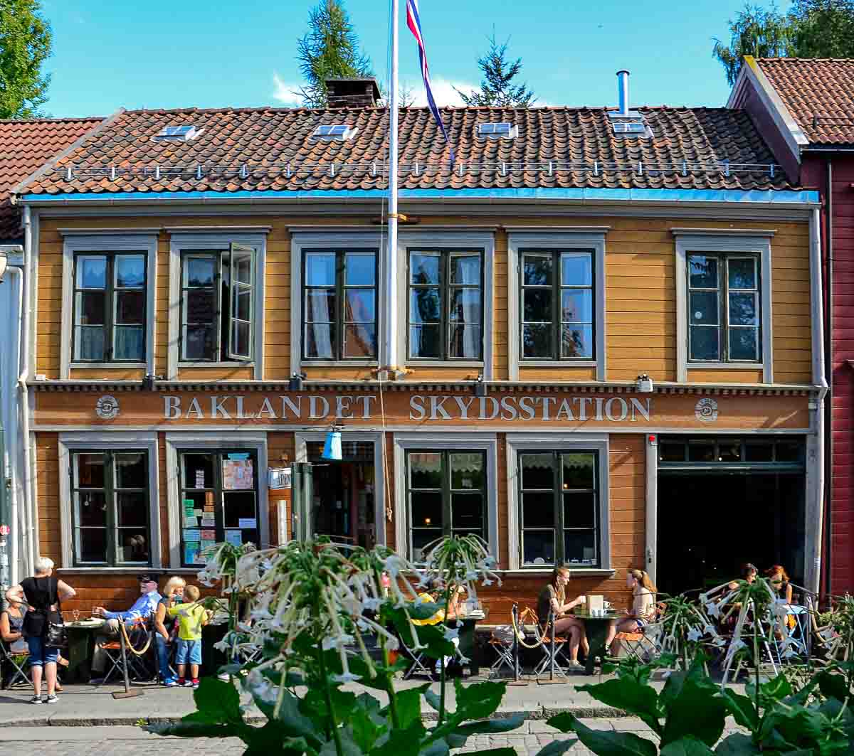 Der Treffpunkt im Quartier schlechthin ist Bakklandet Skydsstation. Das heute sehr beliebte Café entstand am Ende des 18. Jahrhunderts, erfuhr aber in der zweiten Hälfte des 19. Jahrhunderts einige Umbauten. Dass hier einst Milch und Brot verkauft und Pferde gehalten wurden, weiß heute kaum einer der Cafégäste.