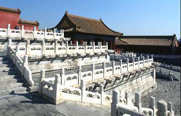Die wichtigsten Gebäude liegen auf der zentralen Nord-Süd-Achse, die sich durch die gesamte Hauptstadt zieht. Vorne, im Süden, hinter riesigen Toren und einem weiträumigen Platz, der den einzelnen Menschen zu einem winzigen Wesen degradiert, ragen die massigen Empfangshallen auf, in denen der Kaiser, verborgen hinter einem Schleier aus Sandelholzrauch, auf dem vergleichsweise einfachen Thron saß. Alle anderen mußten stehen. Dahinter lagen die Wohnquartiere für den Herrscher und seine unmittelbare Familie, die allerdings später zu weiteren Empfangs- und Arbeitsräumen umgestaltet wurden. Zwischen diesen und dem Nordtor befindet sich noch der kaiserliche Garten.