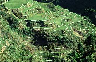 Fährt man von der Küste nach Osten, so erreicht man bald gebirgiges Terrain. Und inmitten dieser philippinischen Zentralkordillere taucht in der Wildheit der Berge plötzlich ein von Menschenhand geschaffenes Kunstwerk auf, eine Kulturlandschaft von Reisterrassen, die sich selbst die steilsten Hänge hinaufzieht.