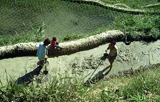 Nach der Ernte ist dann Zeit für größere Reparaturen und das Ausbessern der Begrenzungen. Diese sind nur rund zwanzig Zentimeter breit, und während die Landbewohner sich vollkommen sicher barfuß darauf fortbewegen, fürchtet der städtische Besucher schon den Absturz in das nächst gelegene tiefere Matschfeld.