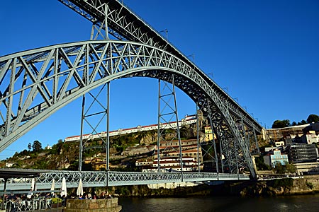 Am Douro-Kai in Porto (1) drängeln sich Touristen. Musiker trommeln, Gaukler zeigen Kunststücke. Auf Tapeziertischen liegen bestickte Tücher zum Kauf. Die Cafés und Restaurants ringsum sind krachvoll. Man hört Französisch, Spanisch, Portugiesisch, Deutsch. Jenseits des Flusses leuchten die Häuser der Portweinfirmen in der Abendsonne. Davor schaukeln die so genannten Rabelo-Kähne im bräunlichen Wasser. Über allem spannt sich wie ein ruhiger Bogen weit die gigantische Eisenkonstruktion der Brücke D. Luis I.