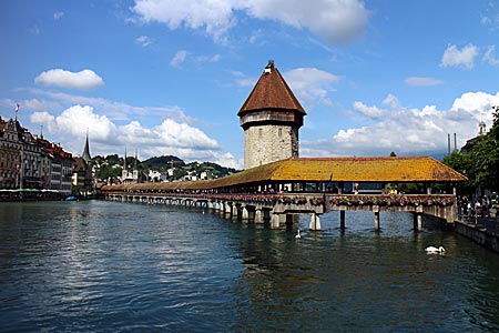Am Anleger „Luzerner Bahnhofskai“ haben an diesem frühen Morgen zwei Schiffe festgemacht. Sie chauffieren Ausflügler zu den Zahnrad- und Seilbahnen, mit denen sie die Berge entlang des Seeufers erstürmen: den Hausberg Pilatus, das Sanserhorn oder die Königin der Berge, die Rigi. An Brücke 1 lässt die 1901 gebaute „Uri“ weiter ordentlich Dampf ab. Sie macht sich Richtung Vitznau unterhalb der Rigi und weiter in den Urnersee bis Flüelen auf den Weg. Passagiere, die mit Koffern und Taschen bepackt bis zu dieser Endstation fahren, sind auf der Wilhelm-Tell-Route unterwegs. In Flüelen steigen sie um in den Wilhelm-Tell-Expresszug nach Locarno oder Lugano. In die entgegengesetzte Richtung nach Alpnachstad am Alpnacher See startet von Pier 2 ein modernes Motorschiff, die „Winkelried“, zur „goldenen Rundtour“.