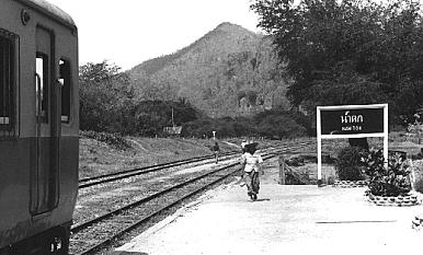 Nam Tok, das ist mitten im Dschungel Thailands: Es gibt nur ein kleines Häuschen hier und das ist der Bahnhof. Es ist die Zeit der Mittagshitze, die Luft flimmert, man hört nur einige Geräusche vom Fluß. Die wenigen Leute, die mit uns gereist sind, sind längst weggeeilt. Wir gehen den Gleisen nach, die irgendwann aufhören. Noch ein, zwei Kilometer weiter, dann hat der Dschungel alles, was einmal die Thailand-Burma-Bahn gewesen war, zurückerobert. 163 Kilometer weiter liegt der Drei-Pagoden-Paß zwischen Thailand und Burma. Es heißt, dort sei heute ein Dorado der Schmuggler und Schwarzmarkt-Händler. Manches, was auf dem Markt von Rangun in Burma/Myanmar angeboten wird, kommt von dort. Ursprünglich waren es von der Abzweigung Nong Pladuk bei Bangkok bis nach Moulmein in Birma 471 Kilometer Schienen. Von dort bestand dann die Bahnverbindung nach Rangun, in Burmas Hauptstadt.