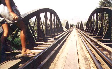 Wir fahren nun auf das berühmte hölzerne Viadukt der Bahnlinie zu, das regelrecht am Fels klebt, eine waghalsige Passage. Der Zug passiert Zuckerrohr-Felder, Bananenstauden, Pinien, Reisfelder. Den Dschungel haben wir nun hinter uns gelassen, wir sind wieder unten am Fluß, überqueren langsam - die Lok tutet, damit die Fußgänger Platz machen - die berühmte Brücke am Kwai. Und dort steigen wir aus.