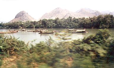 Der Zug fährt an und der Schaffner weist uns wieder auf jene Stellen hin, an denen wir den Kopf aus dem Fenster strecken sollen: "Take a photograph! It's nice!" Aber "nice" ist gar kein Ausdruck für diese Bahnreise durch den Dschungel Thailands. Wenn die Berge, deren Gipfel oftmals ganz nahe sind, abfallen, breitet sich der dicke grüne Teppich aus. Mittendrin fließt der von Löß und Lehm gelb gefärbte träge Kwai Yai ("der große Kwai"), der hier die Straße ersetzt.