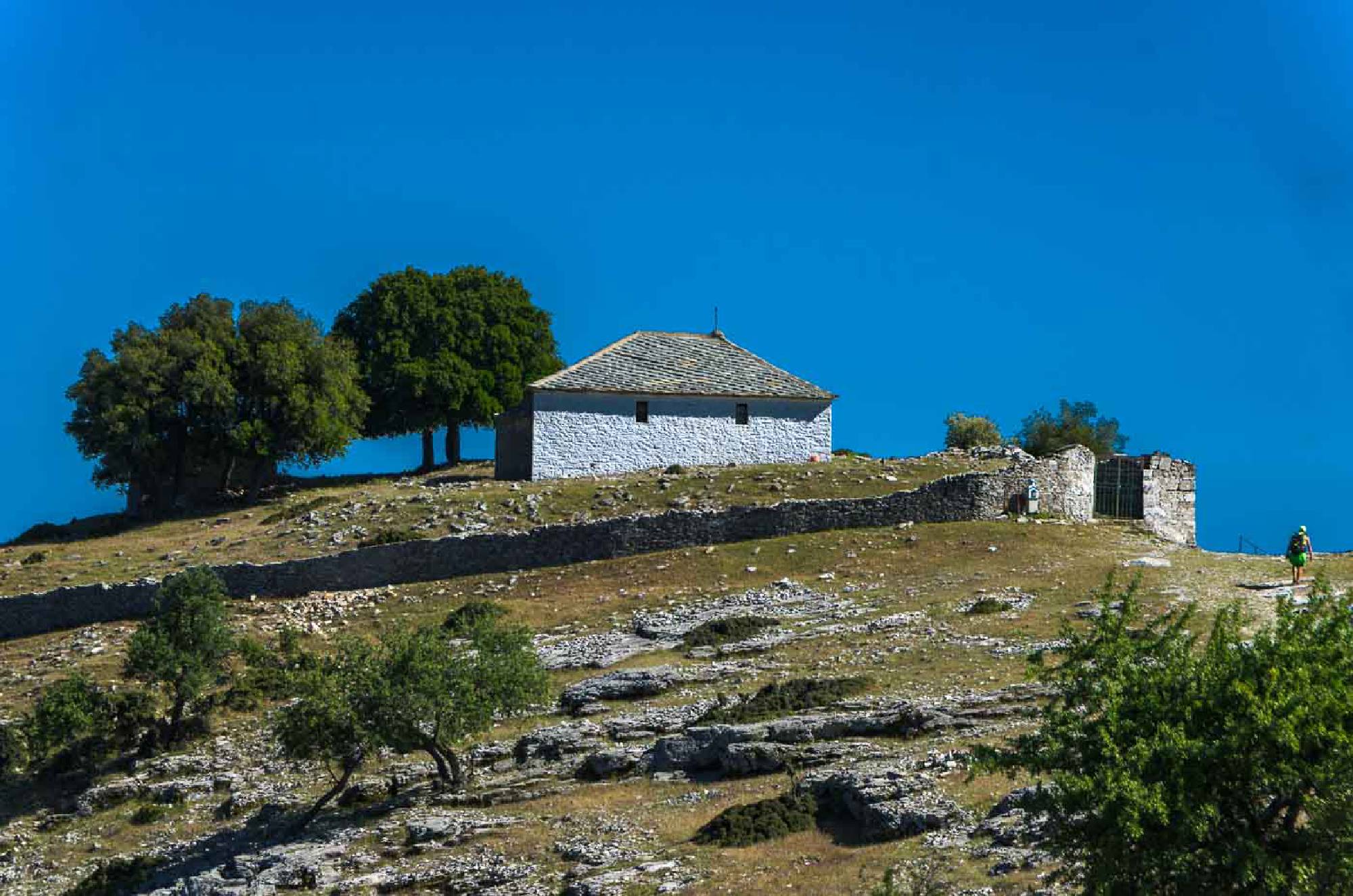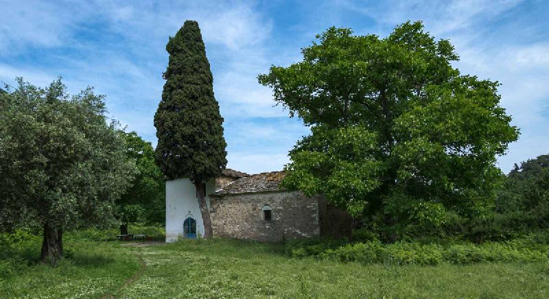 Die Bergwelt südlich von Limenas birgt so manches Kleinod, so stoßen wir auf unserer Wanderung auf eine. einsame Kirche, die in ihrer Schlichtheit bis heute gelebte Frömmigkeit widerspiegelt. Hier entdecken wir mannshohe Farne, die früher große Teile der Insel bedeckten, aber durch gewaltige Brandkatastrophen in den letzten Jahrzehnten stark dezimiert wurden. Neben Kiefern, Eichen und Platanen sind es vor allem die silbrig in der Sonne glänzenden Olivenbäume, die das Bild der Insel prägen. Kaum eine Familie auf Thassos, die nicht einen eigenen Olivenhain besitzt, aber auch Nuß- und Mandelbäume, Quitten und Feigenbäume sind unsere stetigen Begleiter.