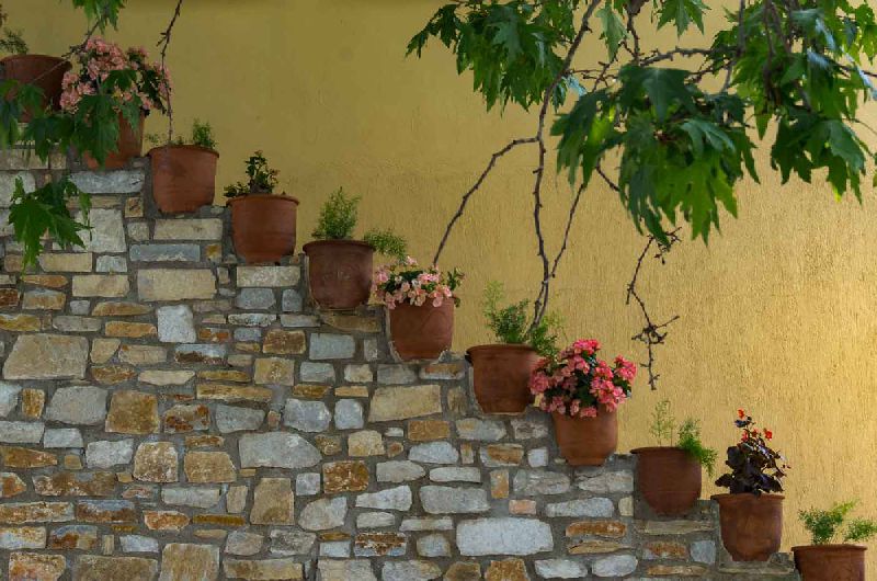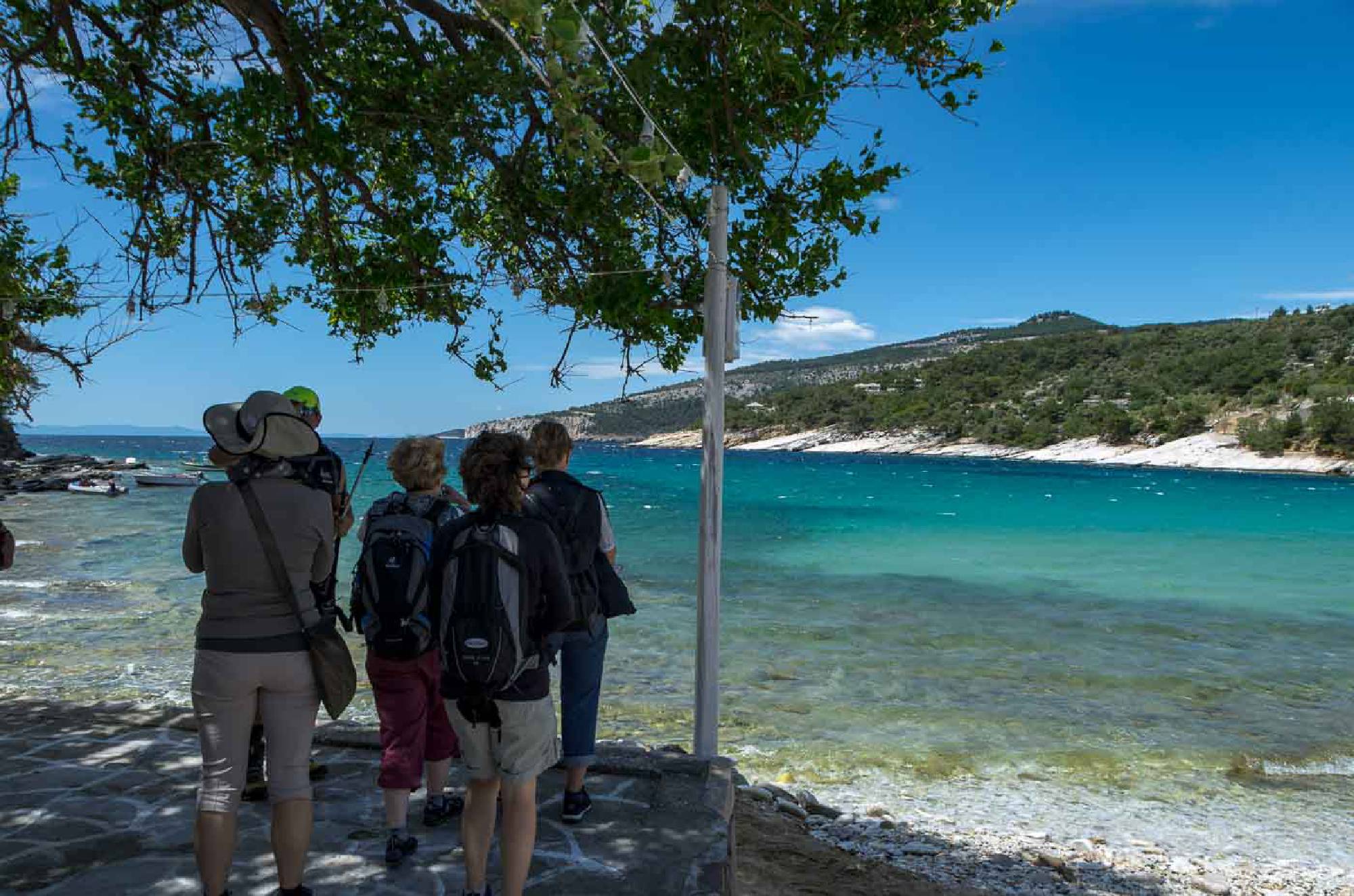 Gestärkt durch ein abwechslungsreiches Frühstücksbuffet geht es am ersten Morgen gleich in die Berge. Die “Grüne Insel” macht ihrem Namen alle Ehre, es geht durch lichte Olivenhaine mit eindrucksvollen, altehrwürdigen Olivenbäumen, deren Alter nur schwer abschätzbar ist. Schattige Pfade wechseln sich mit sonnenbeschienenen Teilstücken ab. Hinter Mikro Kazavitis kommt Megalo Kazavitis in Sicht, das im Grün der Berghänge fast verschwindet.