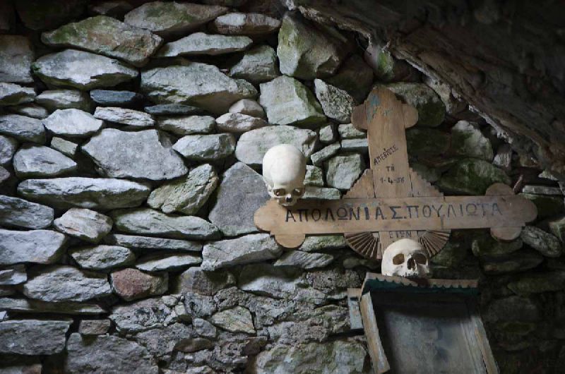 Kastros Einwohnerzahl zu bestimmen ist gar nicht so einfach. Denn in den Wintermonaten lebt in dem 5oo Meter hoch gelegenen Dorf überhaupt niemand. Doch nachdem in den letzten Jahren viele der dem Verfall preisgegebenen Häuser wieder renoviert wurden, kehrt wieder Leben ein hier oben. Zumindest von Frühjahr bis Herbst. Besucher werden belohnt durch einen einzigartigen Blick über die Insel und die Stille dörflicher Abgeschiedenheit. Wer will, kann ein skurril anmutendes, mit Knochen und Schädeln gefülltes Beinhaus besuchen oder sich in dem Kafenion direkt neben der Kirche niederlassen, wo er von Kostas bedient wird, der viele Jahre seines Lebens in Bremen verbracht hat.