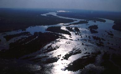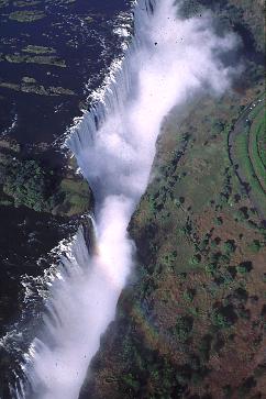 "Rauch mit Donner". Schon zehn, fünfzehn Kilometer stromaufwärts, dort, wo der Zambesi River sich noch gemächlich wie ein grauglitzerndes Band durch die Urwaldlandschaft von Zimbabwe schlängelt, hört man an windstillen Tagen ein stetiges, fernes Grollen. Wie Donner in einem Gewitter, das nie endet. Kein Strudel deutet darauf hin, auch noch fünfhundert Meter vor den Fällen nicht, daß der viertlängste Fluß Afrikas sich zu den spektakulärsten Wasserfällen des Kontinents verwandelt, wo in einer Minute 550 Millionen Liter Wasser mit ohrenbetäubendem Getöse in die Tiefe stürzen. "Welch unvergeßliches Erlebnis" schrieb 1918 Seraphine de Beauchamps an ihre Verwandten in Paris und sie beschreibt, wie das Wasser an fünf verschiedenen Stellen in dichten Kaskaden über die Felsen stürzt, sich in Nebel aufzulösen scheint, weil die Gischt so dicht ist, daß man die Fluten nicht mehr fallen sieht, und wie die Sonne einen strahlend bunten Regenbogen über den Abschnitt der Rainbow Falls spannt.