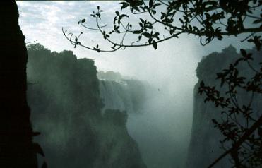 Durch den Park des Hotels ist es ein nur zehnminütiger Spaziergang bis zum Eingang des heutigen Victoria Falls National Parks und von hier aus kann man bequem durch die Anlagen und entlang der fünf verschiedenen Aussichtspunkte die zwei Kilometer lange Fallstrecke der Victoria Falls erwandern. Am Devils Cataract, wo neben der Büste Livingstones zwei ineinander verschlungene Kaskaden von so weit oben herabfallen, daß man glaubt sie kämen direkt aus dem Himmel, beginnt der Spaziergang, der zu den Mainfalls weiterführt. Es würde sich übrigens als ein Irrtum erweisen, hier mit dem Erhalt einer gepflegten Dauerwellenfrisur zu rechnen, denn die Luft an den Wasserfällen ist naß wie das Innere eines Schwammes. Deshalb, um sich und die mitgebrachte Kamera zu schützen, empfiehlt es sich, am Parkeingang Regencapes zu mieten, und deshalb sehen alle im Park umherwandelnden Gestalten wie figurlose Dreiecke auf Beinen aus – mit einer Zipfelkapuze da, wo der Kopf ist.