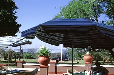 Von der Terrasse betrachtet liegt der Park wie ein Ausschnitt aus einem Bild der schottischen Highlands zwischen Hotel und Wasserfällen und die Herren vom Nebentisch sind dieser Atmosphäre in ihren Tweedjackets und Cordhosen geradezu angepaßt. Einige Damen tragen Hüte und den Khakigewandeten fehlen zu ihrem Safari Outfit nur noch Patronengurte und die Gewehre an der Stuhllehne.Da läßt es sich, die Beine bequem auf die Umrandungsmauer gestreckt, mühelos an den Nachmittag zurückdenken, als weiland 1905 Ihre Hoheit Prinzessin Christiana von Schleswig Holstein hier gesessen haben muß und mit ihr ganze Gruppen adligen Gefolges. In den Büschen zwitschern die Vögel, aus den Kronen der Mopanebäune am Swimmingpool zetern Affen um ihr Hausrecht; aus der Richtung, wo der Gemüsegarten liegt, dringt aufgeregtes Grunzen und Quieken von Warzenschweinen, das vom Geschrei eines Gärtners verstärkt wird und nicht weit, bequem in Sichtweite donnern die Victoria Falls zu Tal und dabei steigt die Gischt in Säulen auf, wie "Rauch".Durch den Park des The Vic Falls (angehobene und sanft gekrauste Nase!) ist es ein nur zehnminütiger Spaziergang bis zum Eingang des heutigen Victoria Falls National Parks, von wo aus man bequem, wenngleich in Plastikcapes gehüllt - der Frisur und der Kamera wegen – entlang der fünf verschiedenen Wasserfälle der Victoria Falls spazieren kann. Wenn man dabei nach oben schaut, an den Kaskaden der weißlichblauen Fluten entlang und über die Regenbögen und Millionen kleiner Kaleidoskope hinweg, sieht man, so der Wind die Gischtschleier beiseite weht, die stählerne Konstruktion der Victoria Falls Bridge.